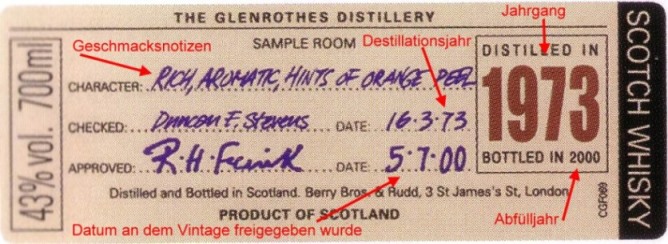 Erklärung: CHECKED: Heißt das an diesem Tag, oder aber auch darauf folgenden Tagen, gewisse Batches als Abfüllung für Glenrothes freigegeben wurde. Wer Glenrothes kennt, weiß, das nur 2% in Single Malts fließt. 98% gehen in Cutty Sark oder Famous Grouse Blended Whisky. An diesem Tag hat der Distillery Manager den Batch für Vintage von Glenrothes freigegeben. Es kann sich hierbei um das Destillat von diesem und darauf folgenden Tagen handeln. Auf jeden fall wurde das Destillat auf 63,5% reduziert APPROVED: Heißt, das an diesem Tag der Vintage freigegeben wurde. Der Master Destiller hat ein oder mehrere Batches aus dem Jahr des Vintage freigegeben zum Abfüllen. Wann letztendlich die Flaschen abgefüllt wurden steht unter der roten, heutzutage auch grünen Vintage Zahl. Auf jeden fall sind alle Vintage nur in begrenzter Stückzahl zu haben. Dies liegt zwischen 3500 bei dem niedrigsten und beim meisten abgefüllten Vintage bei über einer Million Flaschen. Genauso funktioniert dies auch mit dem neuen Label!